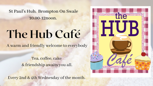 We would love to see you at the Hub Café this Wednesday from 10am -12noon. It's a great space to meet up with friends old and new, whilst enjoying delicious cakes and drinks.
