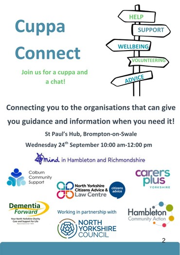 We are all really looking forward to sharing the morning with you! Meet local organisations offering support, wellbeing advice, and volunteering opportunities—all in one welcoming space. It’s more than just a brew—it’s a chance to connect, recharge, and discover what’s available locally. No need to book, just drop in! On Wednesday 24th September in Hub Café in St Paul's Hub, Brompton On Swale from 10.00am - 12noon.
