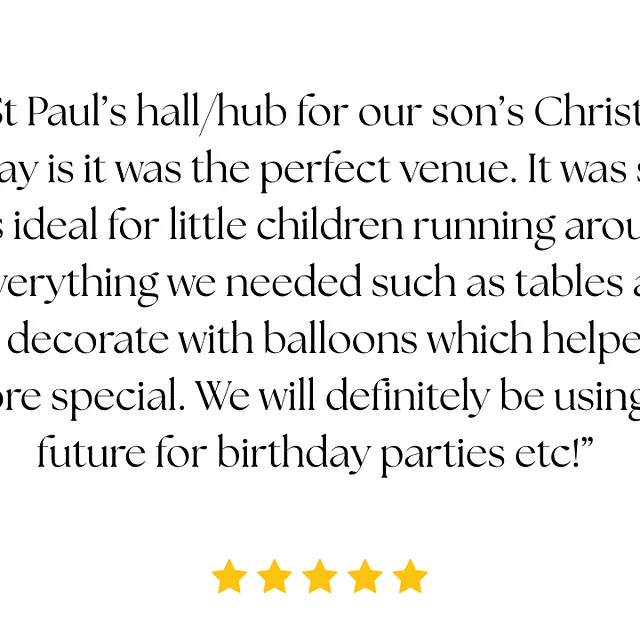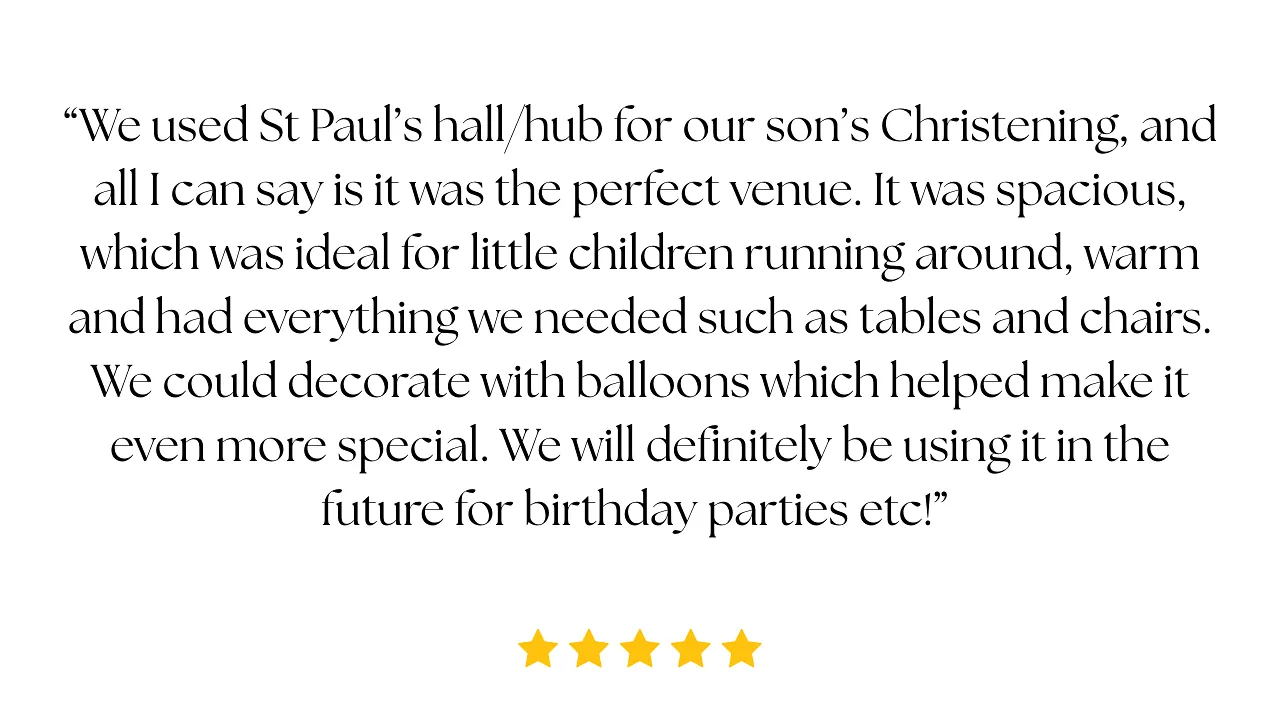 We have a fabulous facility which includes a large main hall, kitchen and two toilets. St Paul’s Hub has its own private car park for you to park and the Hub is fully accessible to all users.