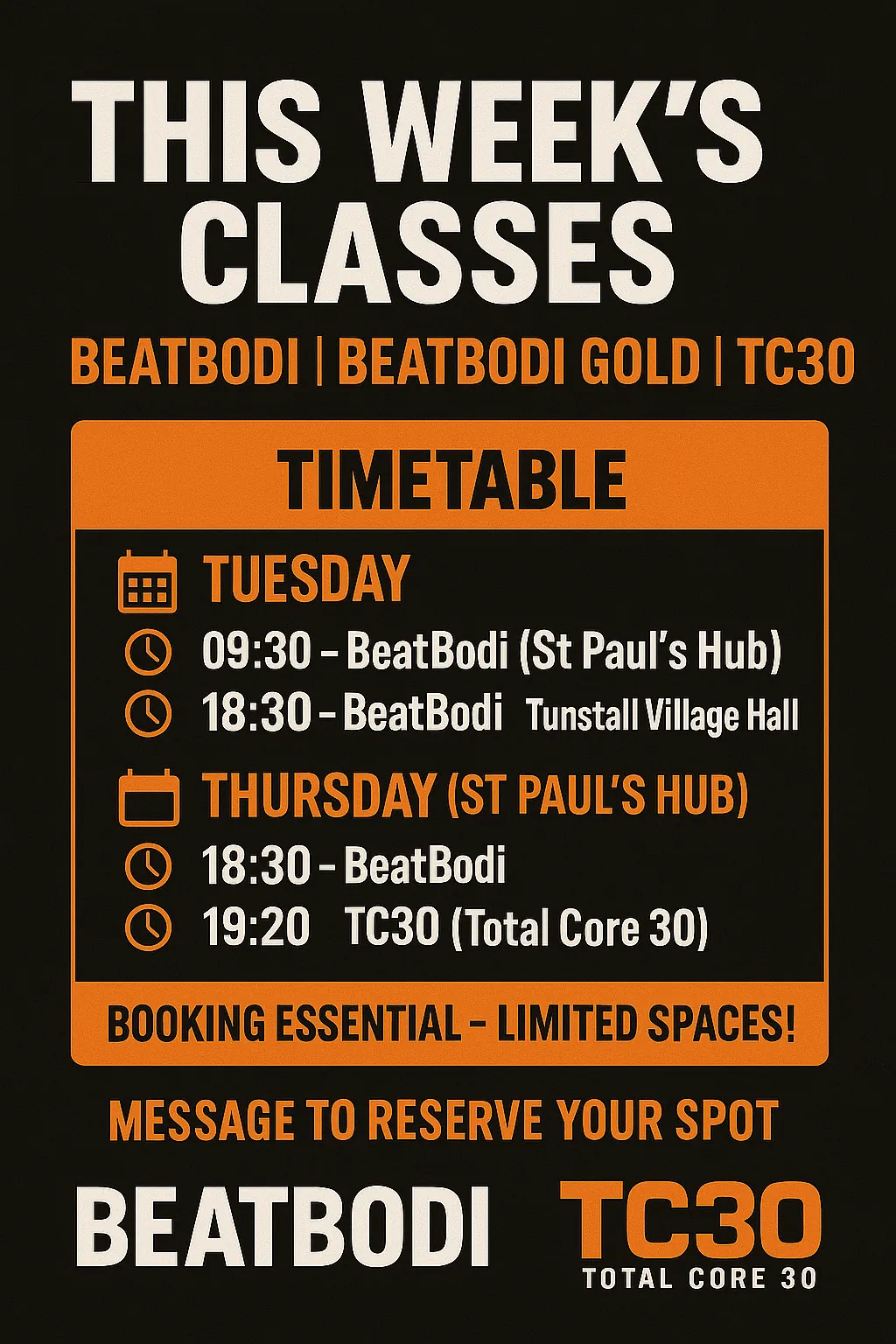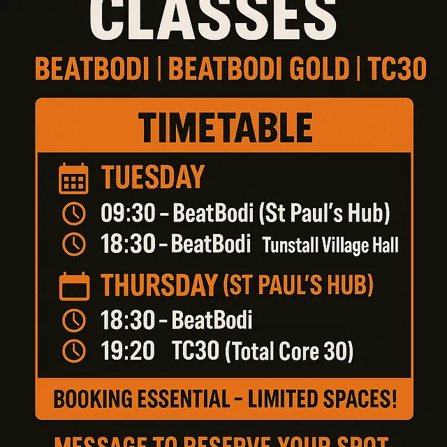 Thursday - BeatBodi - 6.20pm - 7.20pm + Total Core 7.20pm - 8.00pm